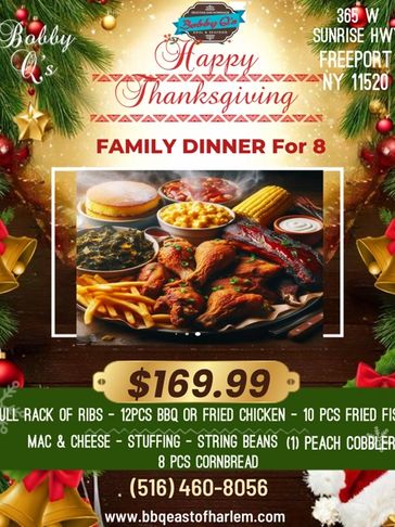 Our mission here at Bobby Q's Jus Like Mama's is to help make the holidays a joyous occasion. Please pre-order your meal deal at least 5-10 DAYS prior to the holiday so that we can appropriately season and prepare your delicious experience. We accept all major credit cards.