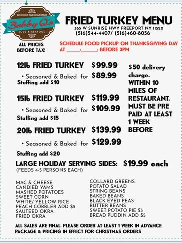 SEE BELOW FOR YOUR SELECTIONS. THINKING OF A FRIED TURKEY? LOOK NO FURTHER. ORDER YOUR SIZE TURKEY FRIED, BAKED, (FOR AN ADDITIONALL PRICE) JERKED, LEMON PEPPER, CAJUN OR SMOKED. ALL ORDERS MUST BE PAID IN ADVANCE