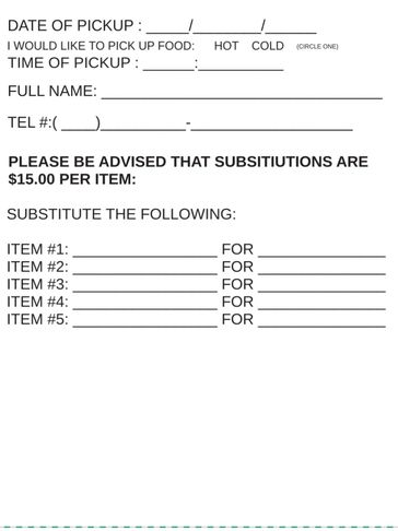 $15 Fee for Substitutions. Please remember that we also cater for many different occasions throughout the year. All meals are required to be picked up before 3pm on Thanksgiving Day. If you like you can pick up the day before as well.